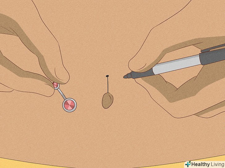 Виберіть місця проколів. як правило, люди роблять пірсинг вище пупка. Прикладіть до пупка прикраси, які ви будете носити, і визначте місце, де ви будете проколювати шкіру. Відзначте маркером місце, куди ви будете вставляти прикраса, і місце, звідки воно буде виходити.