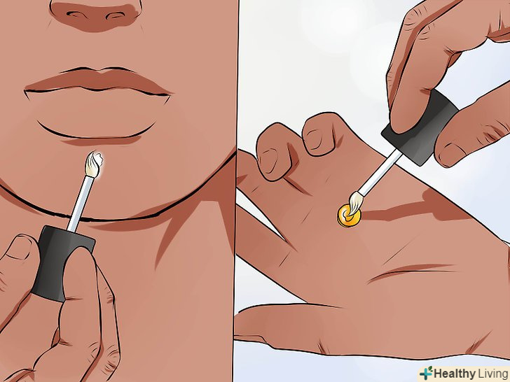 Нанесіть краплю клею на страз і обличчя. застосування театрального клею найбільш ефективно в тому випадку, якщо ви завдасте його одночасно на шкіру і на зворотну сторону страза. [9]- ТЕАТРАЛЬНИЙ клей можна придбати в місцевому магазині святкових костюмів або в інтернет-магазині.