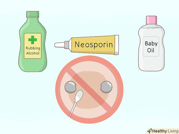 Не використовуйте антисептики, оскільки вони уповільнюють загоєння. не використовуйте засоби для обробки ран, оскільки вони можуть уповільнити процес загоєння проколу або викликати роздратування шкіри. Відмовтеся від таких засобів: [22]- Звичайний або ізопропіловий спирт. Ці кошти мають в'язку дію і не підходять для обробки чутливої шкіри сосків.