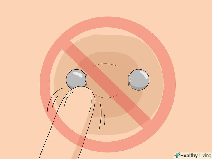 Не торкайтеся пірсингу і не смикайте його. важливо уникати надмірного контакту з пірсингом, поки той заживає. Бактерії можуть потрапити з рук в рану, через що розвинеться запалення. Не дозволяйте партнеру торкатися пірсингу руками або мовою. Якщо вам потрібно доторкнутися до проколу, спочатку ретельно помийте руки з антибактеріальним милом або надіньте рукавички. [23]- Намагайтеся не провертати прикраса і не тягнути за нього в перші кілька місяців, якщо тільки це не потрібно для догляду за раною, інакше рана не буде гоїтися.