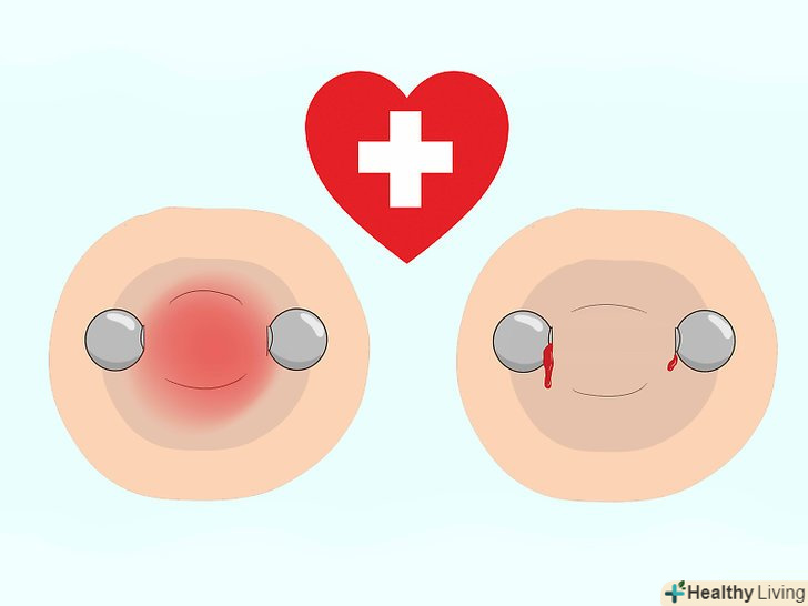 Знайте ознаки інфекції. інфекція не розвинеться, якщо ви будете добре доглядати за проколом. Але якщо Пірсинг запалиться, вам потрібно буде боротися з інфекцією. Ознаками інфекції є біль, почервоніння, виділення крові або гною. Якщо ви виявили у себе ці симптоми, зверніться до лікаря. [24]- Лікар може призначити вам антибіотик для лікування інфекції.