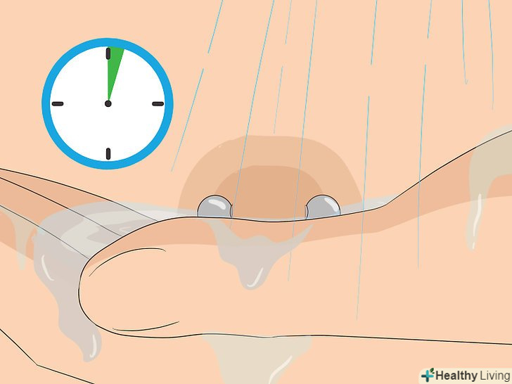 - Нанесіть на Пірсинг м'який миючий засіб без запаху. нанесіть трохи мила на кінчики пальців, а потім акуратними рухами перенесіть мило на сосок. Спінюйте мило навколо соска і пірсингу протягом 5-10 секунд. Намагайтеся не терти шкіру. [17]