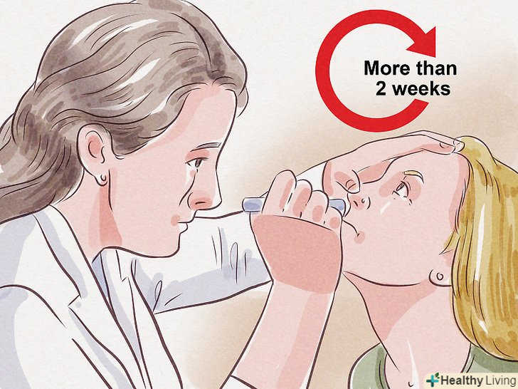Зверніться до лікаря, якщо симптоми тривають більше двох тижнів. іноді інфекція супроводжується лише одним-двома симптомами, і люди сподіваються, що вона пройде завдяки промиванні та лікуванню домашніми засобами. Однак, якщо симптоми не пройдуть через два тижні, слід негайно звернутися до лікаря. Щоб позбутися від інфекції, може знадобитися медична допомога. [11]- Інфекція пірсингу в носі може прийняти дуже серйозний і навіть смертельно небезпечний характер. Крім того, така інфекція може спотворити форму носа.