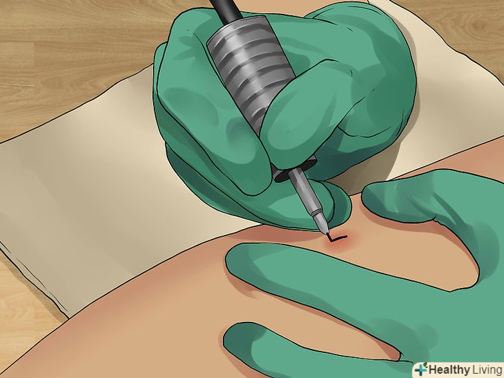 Знайте, що будуть задіяні голки і буде трохи крові. сучасний процес нанесення татуювання має на увазі використання спеціальної машинки, за допомогою якої тату-майстер швидко проколює шкіру голкою, вводячи під неї чорнило. [4] через численні проколів шкіри місце татуювання трохи кровоточить. Якщо ви не переносите виду крові, відверніться і не дивіться.- Розкажіть про ваші відчуття татуювальнику — хороший фахівець обов'язково допоможе вам подолати процес нанесення татуювання з найменшим дискомфортом.