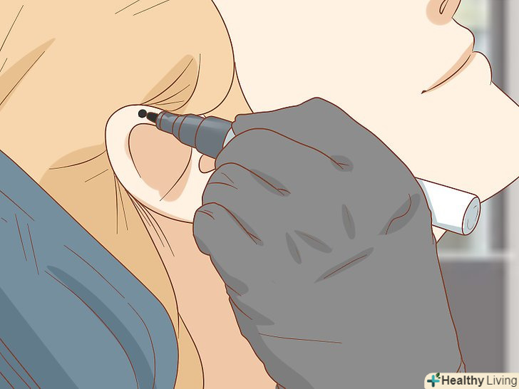 Оцініть передбачуване місце проколу і кут. коли вухо буде продезінфіковано, майстер намітить дві точки, на місці яких буде прокол, і покаже вам, як вони виглядають. Якщо вам щось не сподобається, не бійтеся попросити майстра перенести точки, тому що потім нічого виправити вже буде не можна.