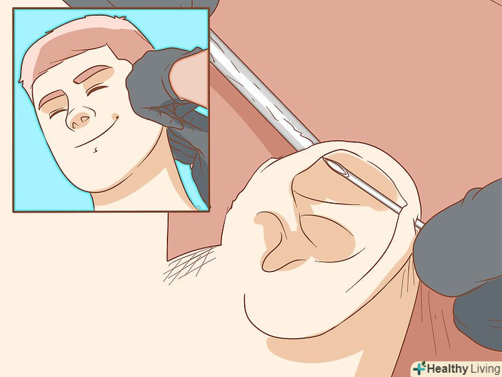 Розслабтеся перед першим проколом. майстер візьме порожню одноразову гру і проткне їй вухо. Потім він вставить в отвір прикраса і прикладе його так, щоб воно з'єдналося з передбачуваним місцем другого проколу. Важливо зберігати спокій, тому спробуйте наступні прийоми розслаблення:- Глибоке дихання.