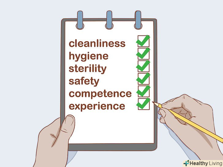 Складіть список вимог до студії. перш ніж зупинити свій вибір на який-небудь студії або майстра, переконайтеся, що вони відповідають вашим вимогам щодо чистоти, гігієни, стерильності, а також безпеки, професіоналізму і досвіду. Щось з цього стане зрозумілим за інформацією на сайті, проте більшу частину нюансів з цього списку вам доведеться з'ясовувати самостійно. Складіть таблицю, щоб вам було простіше записувати інформацію про кожну студію. Задавайте наступні питання:- Як ви забезпечуєте стерильність в приміщенні?