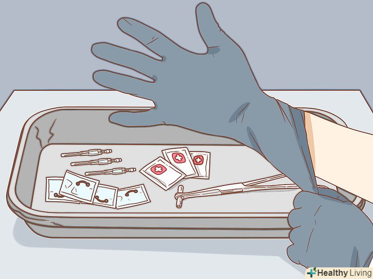 Поспостерігайте за підготовкою. спочатку майстер повинен помити руки, а потім надіти нову пару одноразових хірургічних рукавичок. Всі інструменти повинні бути упаковані в індивідуальні упаковки і запечатані. Їх повинні відкрити перед вами, а потім покласти на піднос. [4] в цей же час майстер підбере відповідне прикраса і голку потрібного діаметру.- Хороший майстер буде пояснювати вам кожну свою дію. Задавайте питання, якщо вони з'являться у вас.