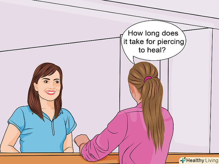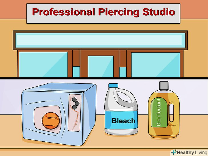 Виберіть надійного фахівця. інфекція виникає приблизно в одному з кожних п'яти випадків пірсингу, і зазвичай це пов'язано з недостатньою стерильністю самої процедури проколювання або неправильним подальшим доглядом за місцем проколу. [13] робіть Пірсинг лише у досвідченого і надійного фахівця і у відповідних санітарних умовах. Перед процедурою попросіть фахівця показати вам, як він стерилізує свої інструменти — він повинен мати автоклав і користуватися відбілювачем і дезінфікуючим засобом.- Фахівці з пірсингу повинні використовувати для проколу нову стерильну голку, ніколи не використовувати одну і ту ж голку повторно, і завжди надягати перед процедурою свіжі стерильні рукавички. [14]