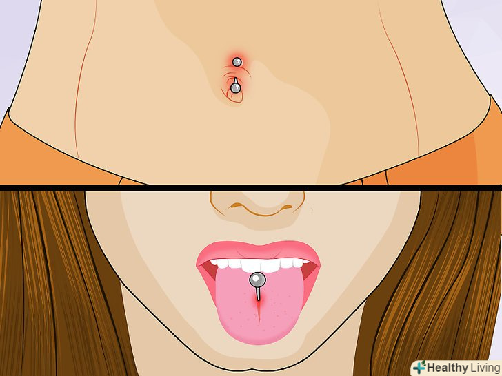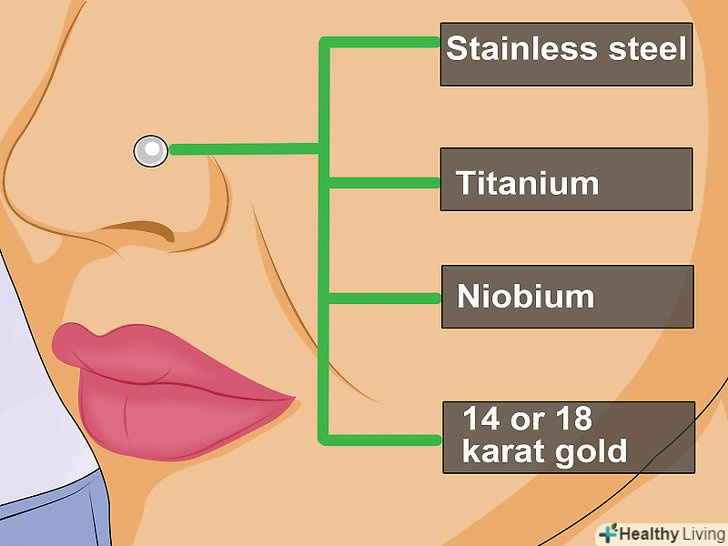 Вибирайте для пірсингу гіпоалергенні прикраси. хоча алергічна реакція на прикраси і відрізняється від інфекції, все, що дратує свіжий прокол, підвищує ризик інфекції. Сильна алергія може також змусити вас вийняти нову прикрасу. Щоб не виникло непотрібних ускладнень, краще завжди користуватися гіпоалергенними прикрасами.- Вибирайте нержавіючу сталь, титан, ніобіум, або золото 14 (585 проба) або 18 карат (750 проба). [15]