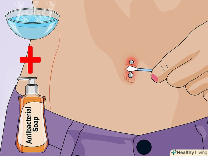 При незначній інфекції спробуйте використовуватиДомашні засоби . візьміть чистий стакан об'ємом 250 мілілітрів (бажано кожен раз використовувати чистий пластиковий стакан), наповніть його теплою водою і розчиніть в ній 1 чайну ложку (7 грамів) нейодированной морської або англійської солі. Замочіть місце пірсингу у воді або змочіть в ній чисту мочалку для обличчя і прикладіть її до проколу. Повторюйте процедуру по 15 хвилин 2-3 рази на день. [17]- При відсутності поліпшень через 2-3 дні або погіршенні симптомів зверніться до свого фахівця з пірсингу або лікаря.