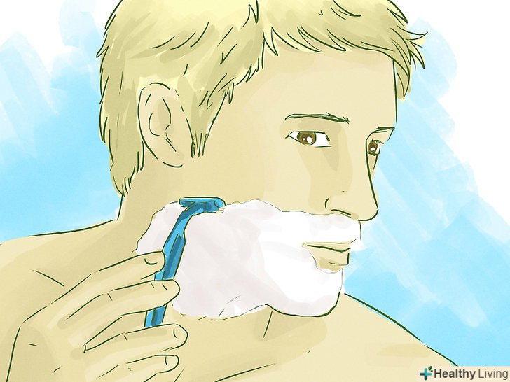 Нанесіть на шкіру гель для гоління і розітріть його до появи густої піни над волосками. чим товще шар піни, тим краще. ніколи не голіть суху шкіру! . Деяким чоловікам легше нанести гель і створити піну за допомогою пензлика для гоління. Наносите нову порцію перед кожним заходом бритви.- Зазвичай вибір гелю/піни для гоління залежить від смаку кожного. Проте, кращими вважаються продукти, засновані на гліцерині і містять такі інгредієнти: воду, стеаринову кислоту, міристинову кислоту, кокосову кислоту, гідроксид натрію і калію, триетаноламін. Краще уникати продуктів для гоління, які містять бензокаїн і ментол, оскільки вони закупорюють пори. [1]