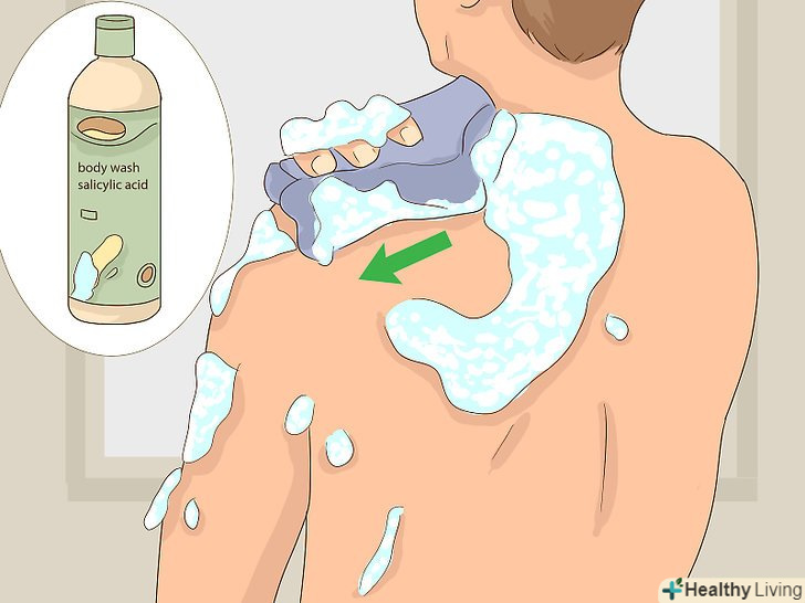Використовуйте гель для душу з саліциловою кислотою, щоб провести відлущування спини. саліцилова кислота допомагає в лікуванні прищів на спині, відлущуючи шкіру і прочищаючи пори. Пошукайте гель для душу, в складі якого є саліцилова кислота. Використовуйте його для миття спини, коли приймаєте душ. [7]