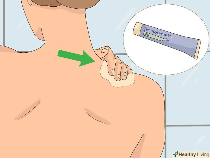 Нанесіть перекис бензоїлу на спину перед сном. бензоїл пероксид-це ліки проти прищів, що відпускається без рецепта, яке ви можете знайти у вигляді крему, лосьйону або гелю ("Базирон ас"). Ця речовина допомагає скоротити акне, вбиваючи бактерії, що провокують появу прищів. Щоночі перед сном наносите на шкіру спини засіб з бензоїл пероксидом. [8]- Бензоїл пероксид може відбілювати тканину. Якщо ви наносите цей засіб на спину, надіньте стару футболку, коли будете лягати в ліжко.