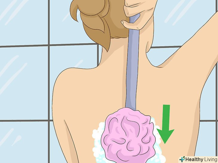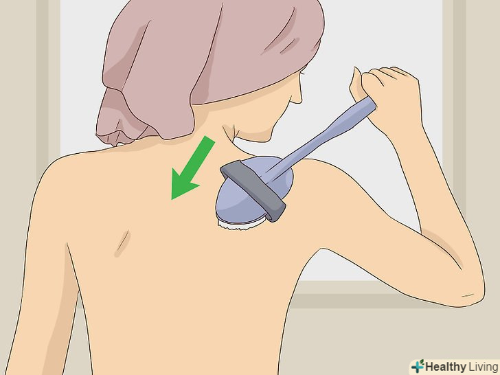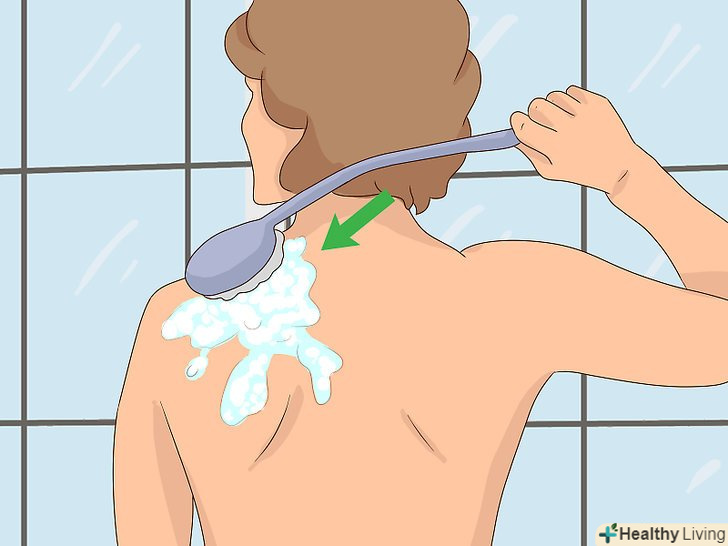 Перед тим як приймати в душ, пройдіться по спині щіткою для тіла з натуральною щетиною. щітка видалить омертвілі клітини шкіри. Заведіть щітку за спину і дбайливими круговими рухами потріть шкіру. [4]
