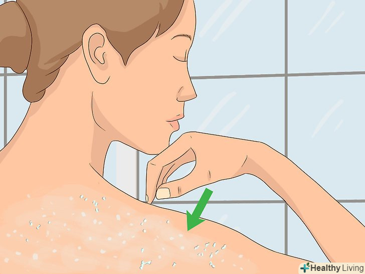 Зробіть відлущування спини в душі за допомогою скрабу для тіла. скраби для тіла містять невеликі гранули, наприклад крупинки солі або цукру, які допомагають відлущувати шкіру і видаляти омертвілі клітини. Якщо ви будете регулярно робити процедуру відлущування, це запобіжить закупорювання пір. Використовуйте мочалку, щоб акуратно розтерти скраб по спині під час прийому душу. [5]
