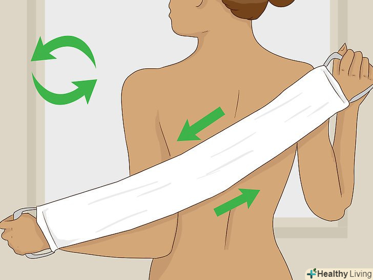 Використовуйте довгу мочалку з ручками, якщо не можете дістати до спини. ця м'яка абразивна мочалка створена для того, щоб полегшити процес відлущування спини. Візьміть ручки мочалки в кожну руку і закиньте через голову до спини. Потім поводите руками з боку в бік, щоб потерти спину мочалкою.