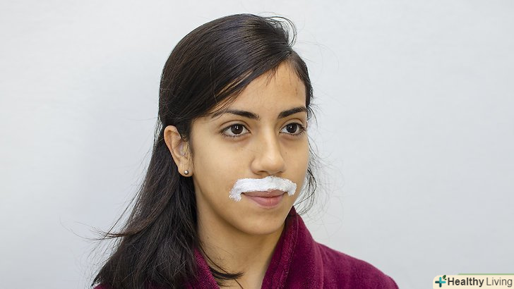 Перевірте крем на невеликій ділянці шкіри. нанесіть крапельку крему на чутливий, але при цьому безпечний ділянку шкіри (наприклад, на внутрішню сторону зап'ястя), щоб перевірити реакцію. Залиште крем на рекомендований час (найчастіше це близько п'яти хвилин), після чого повністю змийте його. Зачекайте 10-15 хвилин, щоб переконатися в тому, що даний крем не викликає свербіж або почервоніння шкіри. [3]- Нанесіть на шкіру над верхньою губою товстий шар крему. одягніть одноразові рукавички і видавіть на палець краплю крему розміром з горошину. Почніть з ділянки під носом і розітріть крем по обидва боки над верхньою губою. При цьому крем повинен покрити шкіру рівномірним товстим шаром. [4]