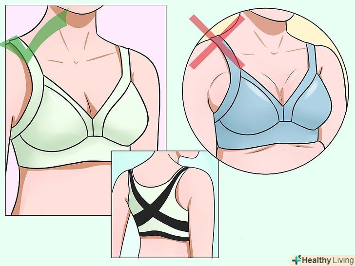 Виконуйте вправи в спортивному ліфчику, який би щільно облягав груди. під час фізичних вправ груди можуть відскакувати на 4-15 сантиметрів. Це піддає навантаженню сполучні тканини, які прикріплюють молочні залози до грудної клітки, а також шкіру, що покриває тканини грудей. Ліфчик за розміром буде утримувати груди на місці, згладжувати рухи і не дасть шкірі і зв'язкам розтягуватися. Можна вважати, що ліфчик сидить правильно, якщо: [5]- Нижня гумка не зміщується, коли ви бігаєте або стрибаєте. Вона не повинна бути занадто тугий, інакше ліфчик буде викликати біль і перешкоджати диханню. Нижня частина дає максимум підтримки грудей.
