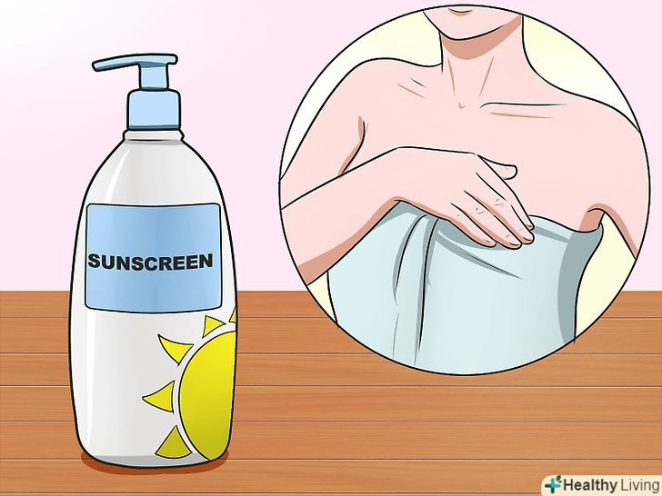 Захистіть груди від пошкоджень шкіри. Майки з глибоким вирізом виглядають влітку красиво і чуттєво, проте через них шкіра і груди піддаються впливу шкідливого ультрафіолету. Ультрафіолет руйнує колаген і еластин, які важливі для здоров'я сполучних тканин. Через це шкіра стає менш пружною і обвисає. [8]- Перш ніж вийти на вулицю надовго, наносите сонцезахисний крем, навіть якщо на вулиці хмарно. Хмари не захищають від ультрафіолетових променів.