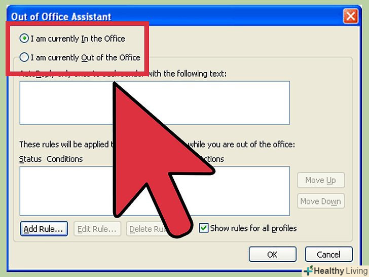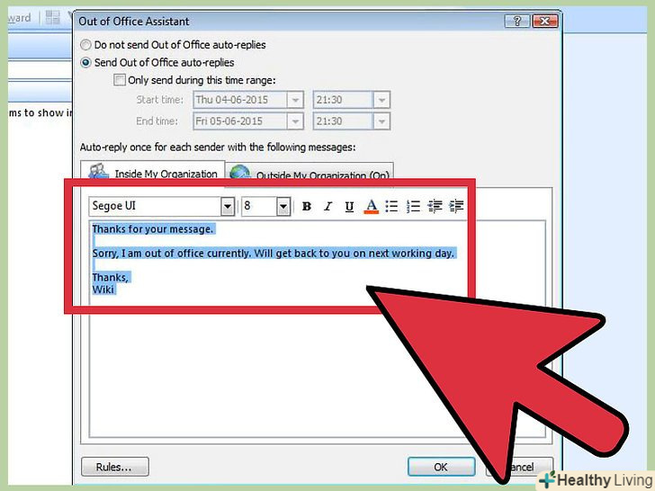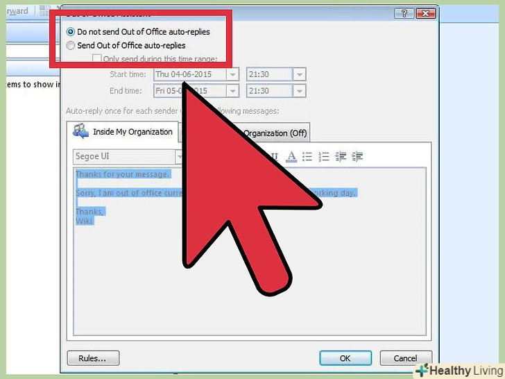 Напишіть свої відповіді.для електронних повідомлень, що проходять через ваш сервер обміну, використовуйте вкладку"Inside My Organization". Щоб відповідати на повідомлення, надіслані від усіх інших, використовуйте вкладку"Outside My Organization". Закінчивши формулювати відповіді, натисніть OK.- Вимкніть функцію автоматичних відповідей. якщо ви задали часовий інтервал, то дана функція буде діяти, як то кажуть, від і до. В іншому ж випадку, Outlook буде розсилати автоматичні відповіді до тих пір, поки ви не відкриєте меню Automatic Replies і не виберете пункт "Do not send automatic replies".