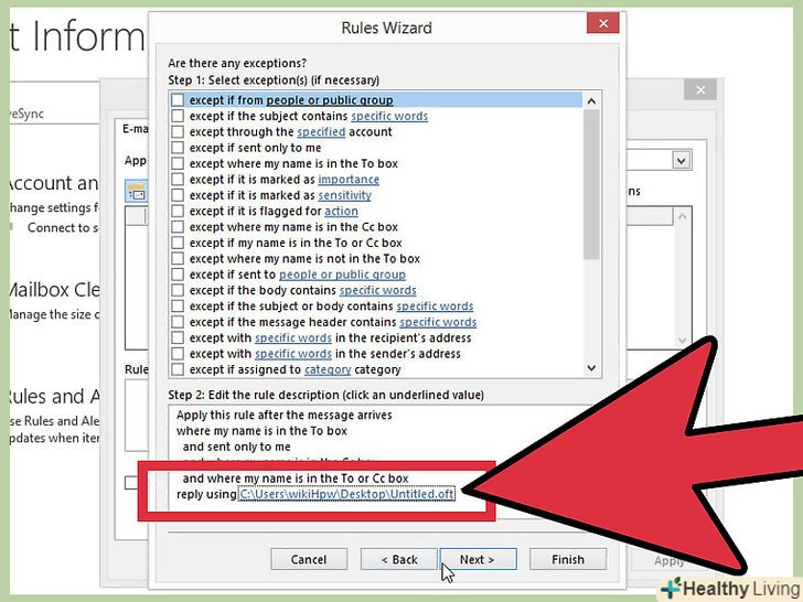 - Встановіть винятки. Коли шаблон буде завантажений, ви можете задати винятки з правил, за допомогою яких ви не будете відповідати конкретним відправникам, на конкретні типи повідомлень і т.д. закінчите з цим, клікніть "Next".