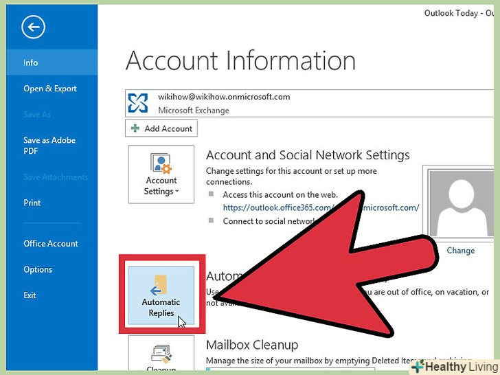 Увімкніть автоматичні відповіді.виберіть папку Exchange, потім виберіть папку зі свого розділу "Вхідні". Щоб побачити опцію "Automatic Replies", у вас повинна бути обрана папка Exchange. Відкрийте меню " Automatic Replies (Out of Office)". Її можна знайти, клікнувши на вкладку File і вибрати вкладку Info.