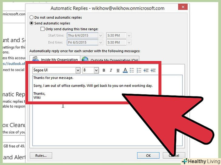 Налаштуйте свої відповіді. в меню Automatic Replies клікніть на поле Send Automatic Replies. Ви можете налаштувати час, коли включиться асистент, задавши відповідну дату і часовий інтервал.