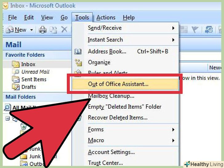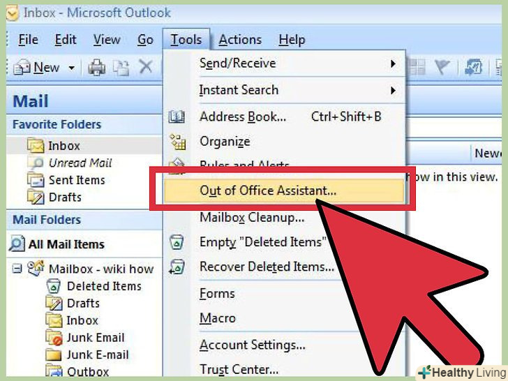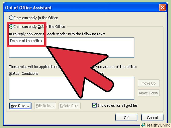 Увімкніть опцію "Office Assistant".виберіть вкладку Tools, потім виберіть "Out of Office Assistant". Виберіть опцію "i'm currently Out of Office".