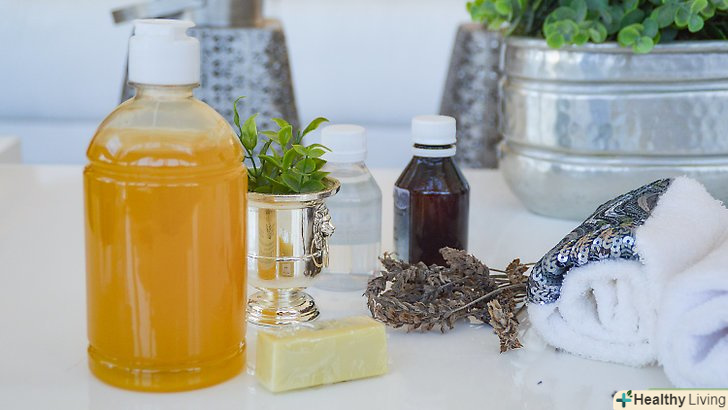 Налийте в ємність мило. вам буде потрібно 1 ½ чашки (337 мілілітрів) рідкого кастильского мила. Можна використовувати мило з запахом або без. Якщо ви виберете неароматизоване мило, то пізніше зможете додати до нього ефірну олію. Якщо у вас немає рідкого кастильского мила, можна використовувати замість нього інше рідке мило або шампунь, проте вони можуть бути не на основі оливкової олії і не вегетаріанськими. Ось кілька варіантів:- М'яке мило для посуду без запаху