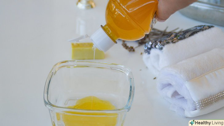 Виберіть мило і залийте його в ємність. мило є основою хорошої піни для ванни, адже саме воно створює бульбашки. Вам знадобиться ½ чашки (112 мілілітрів) будь-якого рідкого мила для рук або тіла , аби воно було м'яким. Мило може бути як ароматизованим, так і ні. Якщо ви використовуєте мило без запаху, пізніше в нього можна буде додати ефірну олію. Якщо у вас немає під рукою рідкого мила для рук або тіла, підійде будь-який з наступних засобів:- Мило для миття посуду, ароматизоване чи ні