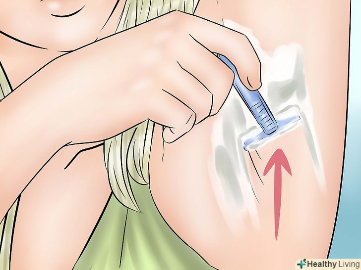 Сильно натягніть шкіру і поголіть голити в висхідному напрямку проти росту волосся.- Гоління в висхідному напрямку збільшить ваші шанси видалити врослі волоски, але в результаті не до кінця видалить менш помітні волоски пахв.