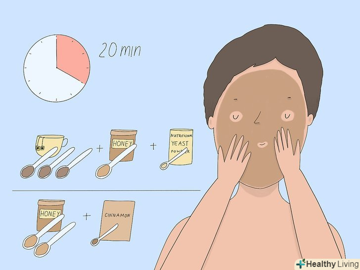 Позбавтеся від прищиків за допомогою маски з меду і ромашки. Використовуйте 2 фільтр-пакети, щоб заварити ромашковий чай. Після того як чай охолоне, налийте 3 столові ложки (35 мл) чаю в маленьку миску і додайте 1 столову ложку (15 мл) сирого меду і 1 чайну ложку (6 грамів) сухих дріжджів (харчових). Перемішуйте інгредієнти, поки суміш не стане досить густою, щоб її можна було нанести на обличчя. Втирайте її в шкіру обличчя кінчиками пальців, а потім залиште вбиратися приблизно на 20 хвилин. Коли будете готові видалити маску, змийте її прохолодною водою. [13]- Якщо ви віддаєте перевагу більш пряний варіант, змішайте 2 столові ложки (30 мл) меду з 1 чайною ложкою (3 гр) кориці. [14]