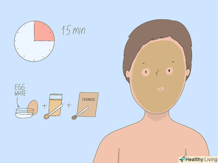Змішайте апельсиновий сік і яєчні білки, щоб звузити пори. відокремте яєчні білки від жовтків і вилийте в невелику миску. Додайте 1 чайну ложку (5 мл) апельсинового соку і ½ чайної ложки (1 гр) порошку куркуми. Збивайте яєчні білки, сік і куркуму разом, поки вони не утворюють рідку суміш. Кінчиками пальців розподіліть рясне кількість суміші по всій поверхні обличчя. Залиште маску на 15 хвилин, а потім змийте її холодною водою. [11]- Куркума корисна, тому що вона допомагає освітлити нерівні ділянки шкіри.