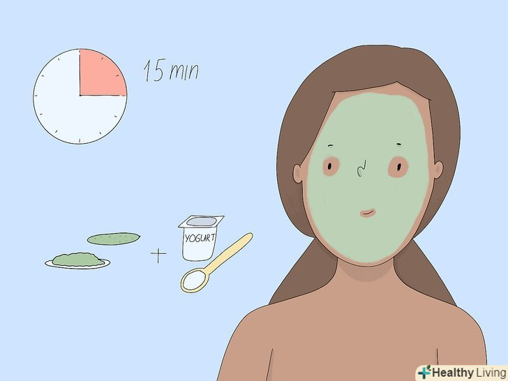 Змішайте огірок і йогурт, щоб пом'якшити шкіру. очистіть огірок і наріжте на тонкі, круглі скибочки. Потім помістіть ці скибочки в блендер разом з 2 столовими ложками (30 мл) білого йогурту без добавок. Змішайте інгредієнти до однорідної маси, а потім перелийте їх в миску поменше, щоб було простіше наносити суміш. Кінчиками пальців розподіліть маску по всій поверхні обличчя і залиште мінімум на 15 хвилин, а потім змийте холодною водою. [12]- Помістіть в холодильник залишки суміші в герметичному контейнері. Її можна буде зберігати аж до одного тижня!