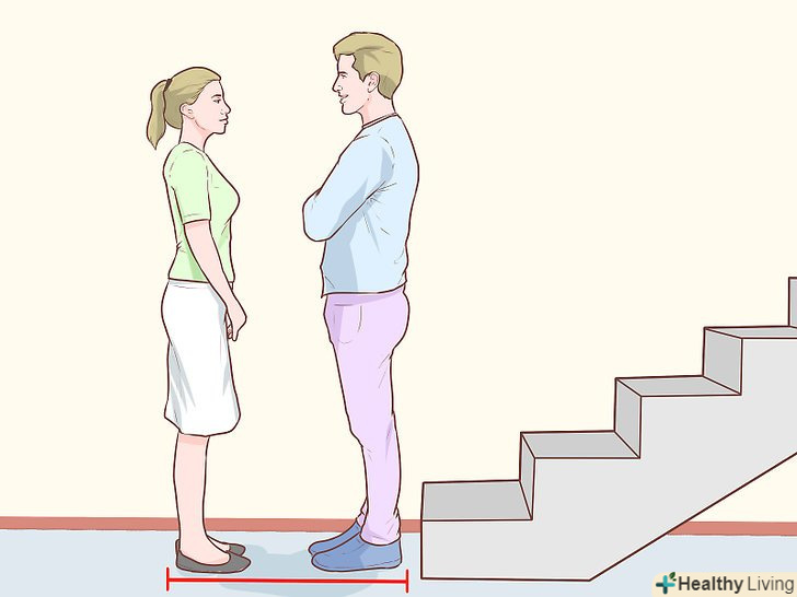 Спілкуйтеся з іншими людьми, стоячи на одному рівні. віддавайте собі звіт в тому, як ви стоїте по відношенню до тих, з ким розмовляєте. Якщо ви перебуваєте на платформі, яка підносить вас над співрозмовником, постарайтеся зійти з неї. Навіть якщо ваш зріст вище зростання співрозмовника, краще стояти з ним на одному рівні, ніж розташовуватися ще вище.- Наприклад, якщо ви зупинилися поговорити з кимось на сходах, спустіться вниз на кілька сходинок.