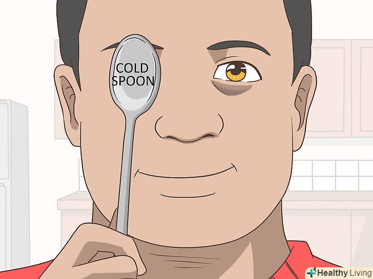 Спробуйте позбутися від припухлості під очима і темних кіл. покладіть холодний компрес на очі, щоб позбутися від темних кіл і набряклості. В якості холодного компресу ви можете використовувати холодну ложку або пакет заморожених овочів. Щоб зменшити набряклість, найкраще спати на спині з піднятою головою. [16]- Покладіть ложку в холодильник, тільки не в морозильник, а то вона буде занадто холодною. Ви можете покласти ложку в холодильник ввечері перед сном.