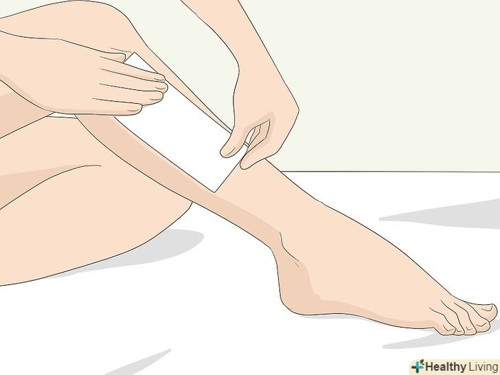 - Робіть епіляцію ніг повільно і обережно. Нанесіть гарячий віск на невелику ділянку шкіри (на один за раз) за допомогою спеціальної палички, помістіть смужку поверх воску і притисніть. Приблизно через 15 секунд швидким рухом потягніть смужку вгору. Повторюйте, поки не зробите епіляцію ніг повністю.