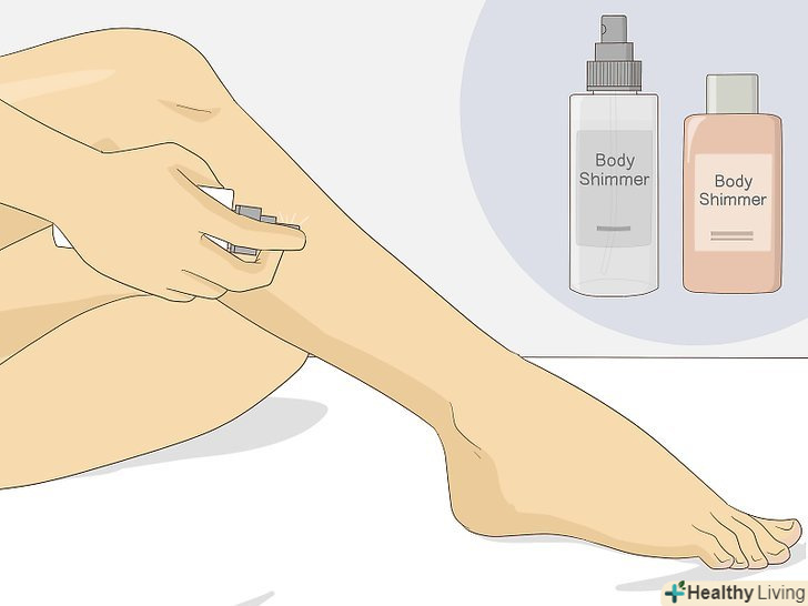 Використовуйте блиск для тіла. Блиск для тіла можна купити в супермаркеті або в магазині косметики. Він продається у вигляді спрею або лосьйону, і є відмінним способом додати шкірі трохи сяйва. Блиски для тіла часто продаються в таких магазинах, як The Body Shop.- Створіть власний блиск для тіла замість того, щоб його купувати. Щоб приготувати блиск для тіла, візьміть свій звичайний лосьйон, додайте трохи золотих або срібних тіней для повік з блискітками і добре перемішайте. Почніть з невеликої кількості тіней (буквально щіпку) і додавайте ще, поки не досягнете бажаного блиску. Нанесіть лосьйон на ноги, як ви зазвичай це робите.