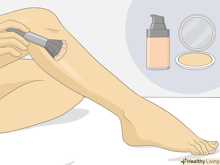 Використовуйте косметичні засоби, щоб додати сяйва ногам. косметичні засоби не тільки надають сяйво, але і вирівнюють тон шкіри. Рідка тональна основа для природного макіяжу відмінно підходить для ніг, так само як і розсипчаста тональна пудра з ефектом мерехтіння. Розітріть рідкий засіб між долонь, а потім розподіліть його по ногах, як якщо б наносили тонкий шар лосьйону. Розсипчасту пудру розподіляйте круговими рухами великий пензлем для пудри. [8]- Знайдіть стійкі тональні засоби, які не бруднять одяг і довго залишаються на шкірі.