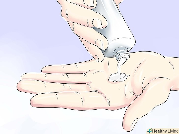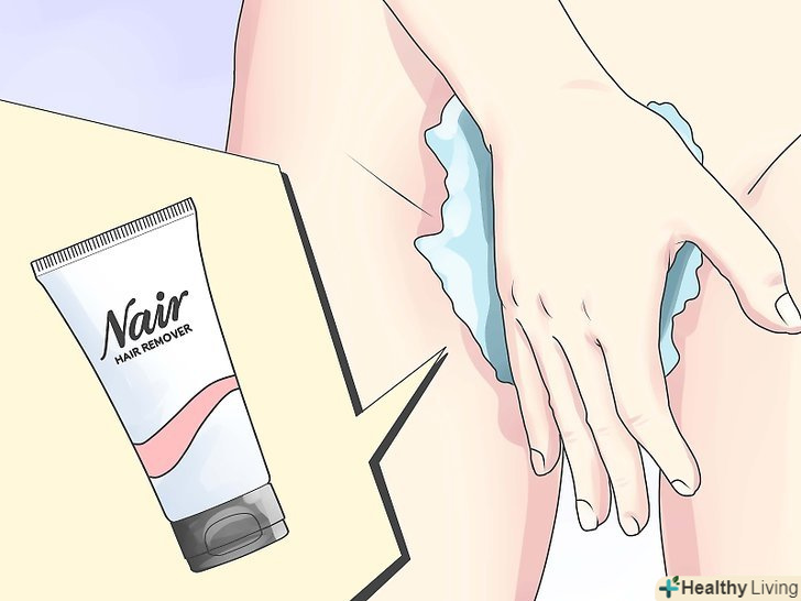 Нанесіть засіб для депіляції. видавіть трохи крему на кінчики пальців і розподіліть його по області видалення волосся. Нанесіть його шаром, достатнім лише для того щоб покрити коріння волосся, але не дуже тонким, щоб шкіра не просвічувалася крізь крем.- Якщо ви видаляєте все волосся, спочатку проведіть тест на самій чутливій шкірі, перш ніж мазати депілятором лобкову зону цілком. [2]