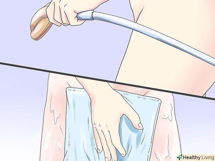 Намочіть шкіру. незважаючи на те, що засіб для депіляції можна наносити і на суху шкіру, якщо ви змочите її теплою або гарячою водою, це розкриє лусочки волосся і полегшить депіляцію. Посидьте кілька хвилин в гарячій ванній або під душем. Промокніть шкіру рушником, щоб вона була лише трохи вологою перед нанесенням засобу для депіляції, і щоб воно не зісковзнуло з шкіри.