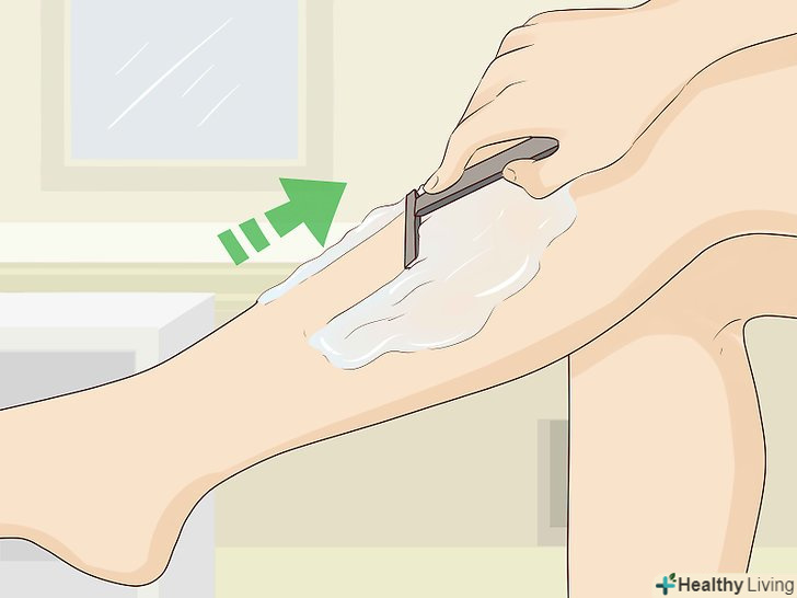 Бритвою плавно проведіть у напрямку знизу-вгору. повільно ведіть бритвою по волоссю. Кожні 13-15 сантиметрів змивайте крем і волосся з лез, а потім повторюйте. Повільно (наскільки це можливо) переміщайте бритву по поверхні шкіри, а потім обполіскуйте леза водою. Повторюйте, поки шкіра не стане гладкою.- Не натискайте занадто сильно на шкіру, а тільки злегка торкайтеся її.