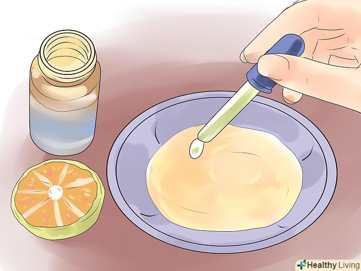 Додайте кілька крапель ефірного масла лимона. [2] вичавіть 3 краплі лимонного масла в рослинне. Змішайте два масла пальцями або пластиковою ложкою.- Цей крок виконувати не обов'язково, у вас повинно вийти видалити ґрунтовку з шкіри і при використанні тільки рослинного масла без добавок. Масло лимона може трохи збільшити ефективність процесу, оскільки слабка кислота в маслі лимона допоможе складу потрапити під ґрунтовку, не пошкодивши при цьому шкіру.