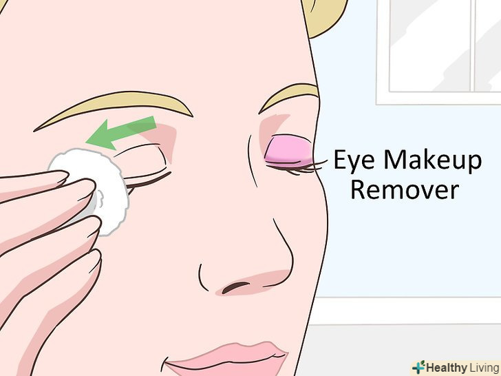 Використовуйте молочко, щоб змити макіяж з очей. цей засіб призначений для видалення косметики. Для цього змочіть ватний диск теплою водою. Нанесіть Очищаюче молочко. Акуратно проведіть ватним диском по Оці, рухаючись від внутрішнього кута до зовнішнього. [11]- Змийте всі надлишки кошти теплою водою.