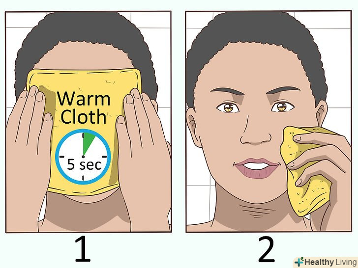 Видаліть залишки теплим рушником. Молочко залишає осад на обличчі. Якщо ви все ще відчуваєте наявність засобу на обличчі, промокніть рушник в теплій воді. Накрийте обличчя цим рушником на п'ять хвилин, а потім зітріть все, що залишилося на шкірі. [7]- Щоб повністю змити осад, можна повторити процес 3-4 рази.