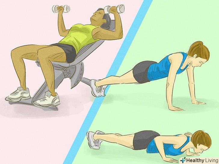 Зміцнюйте м'язи грудей. є кілька силових вправ, які допоможуть натренувати м'язи грудей. Вони можуть і не збільшити розмір грудей, але безумовно зроблять її більш підтягнутою і сексуальною. [14] отже, спробуйте виконати 4 підходи по 8 разів:- Віджимання