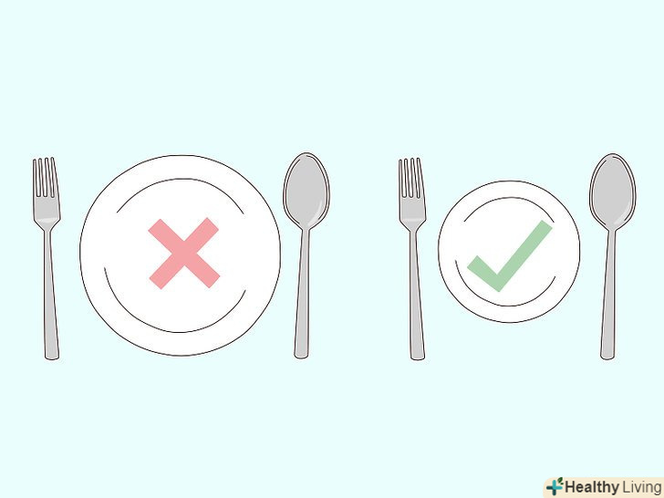 Їжте меншими порціями. більшість людей з'їдають занадто багато їжі за один прийом. Якщо ваша порція розміром походить на ресторанну, значить, їжі занадто багато. Непогано взяти за звичку їсти з тарілки для гарніру, а не з тарілки для вечері, і відправлятися за добавкою тільки тоді, коли ви все ще відчуваєте голод після 15 хвилин після їжі. Вдруге слід заповнити тільки половину тарілки. [10]- Харчування маленькими порціями з невеликими інтервалами теж дуже корисно. Воно також допоможе вам забути про почуття голоду на цілий день.