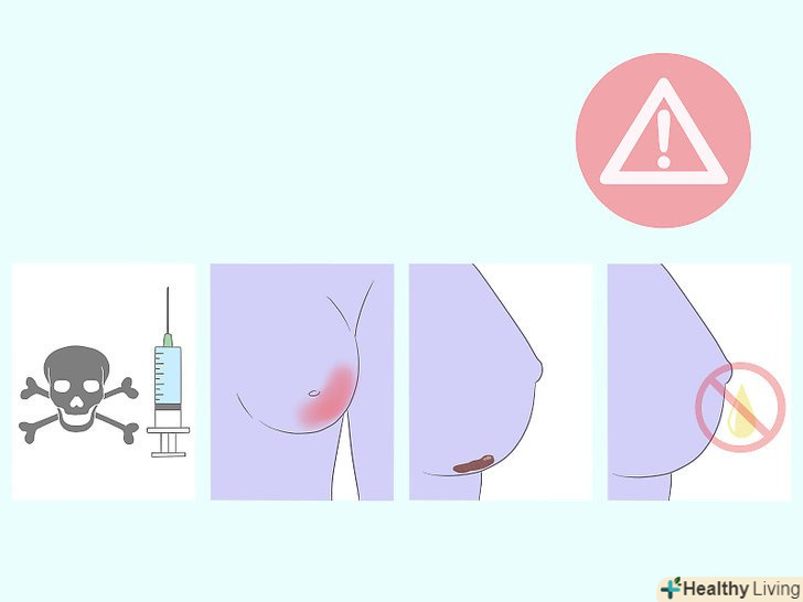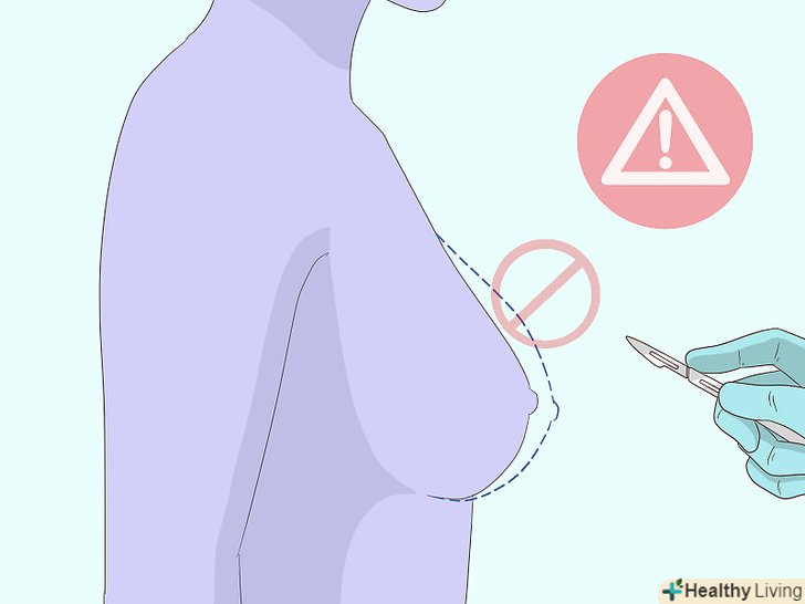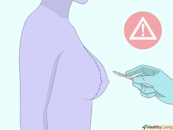 Усвідомте всі ризики. існує цілий ряд ризиків, що супроводжують пластичні операції по зменшенню грудей, багато з яких є універсальними і для будь-якого іншого виду пластичної хірургії: стандартний ризик при використанні анестезії та наркозу, тому що ніхто не застрахований від непередбачуваної реакції організму на препарати і смерті прямо на хірургічному столі. Після операції у вас також може початися інфекція або утворитися згустки крові. Існують і інші ризики: [12]- Є ризик того, що у вас залишаться шрами або навіть келоїдні рубці.