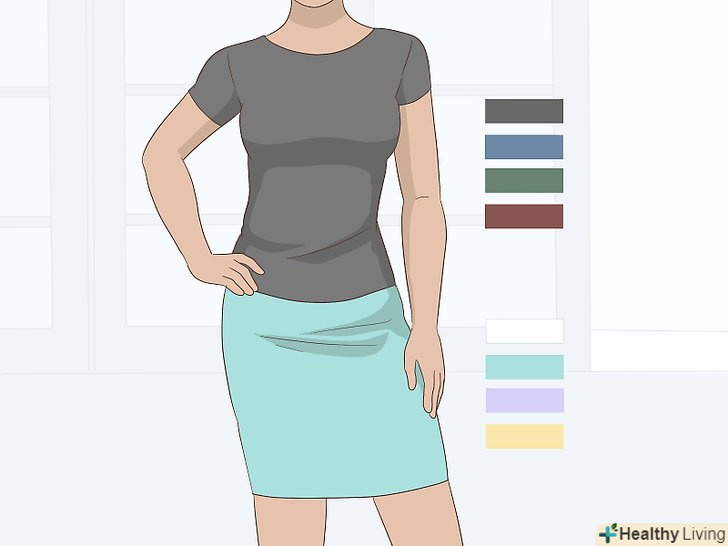 Носіть темний верх і яскраві спідниці або штани. таке вбрання природним чином привертає погляд до нижньої частини фігури, відводячи його від ваших грудей. Наприклад, надіньте чорну облягаючу футболку і бірюзову спідницю. Або віддайте перевагу комплекту з темно-синьої блузки і яскраво-білих брюк. [5]